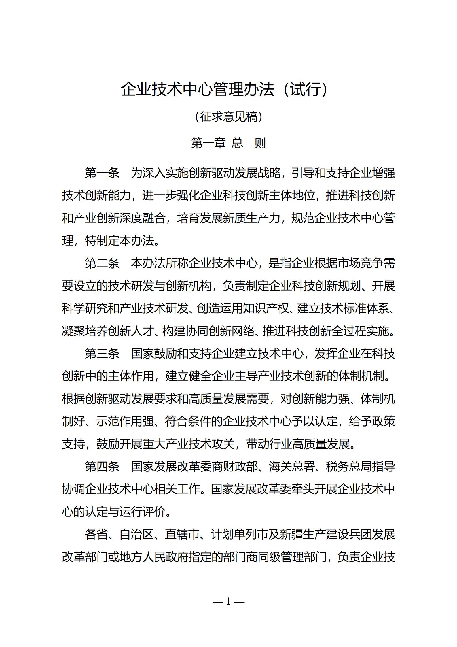 为深入实施创新驱动发展战略,引导和支持企业增强技术创新能力,进一步强化企业科技创新主体地位,推进科技创新和产业创新深度融合,培育发展新质生产力,加强和优化企业技术中心管理,我们起草了《企业技术中心管理办法(征求意见稿)》,现向社会公开征求意见。