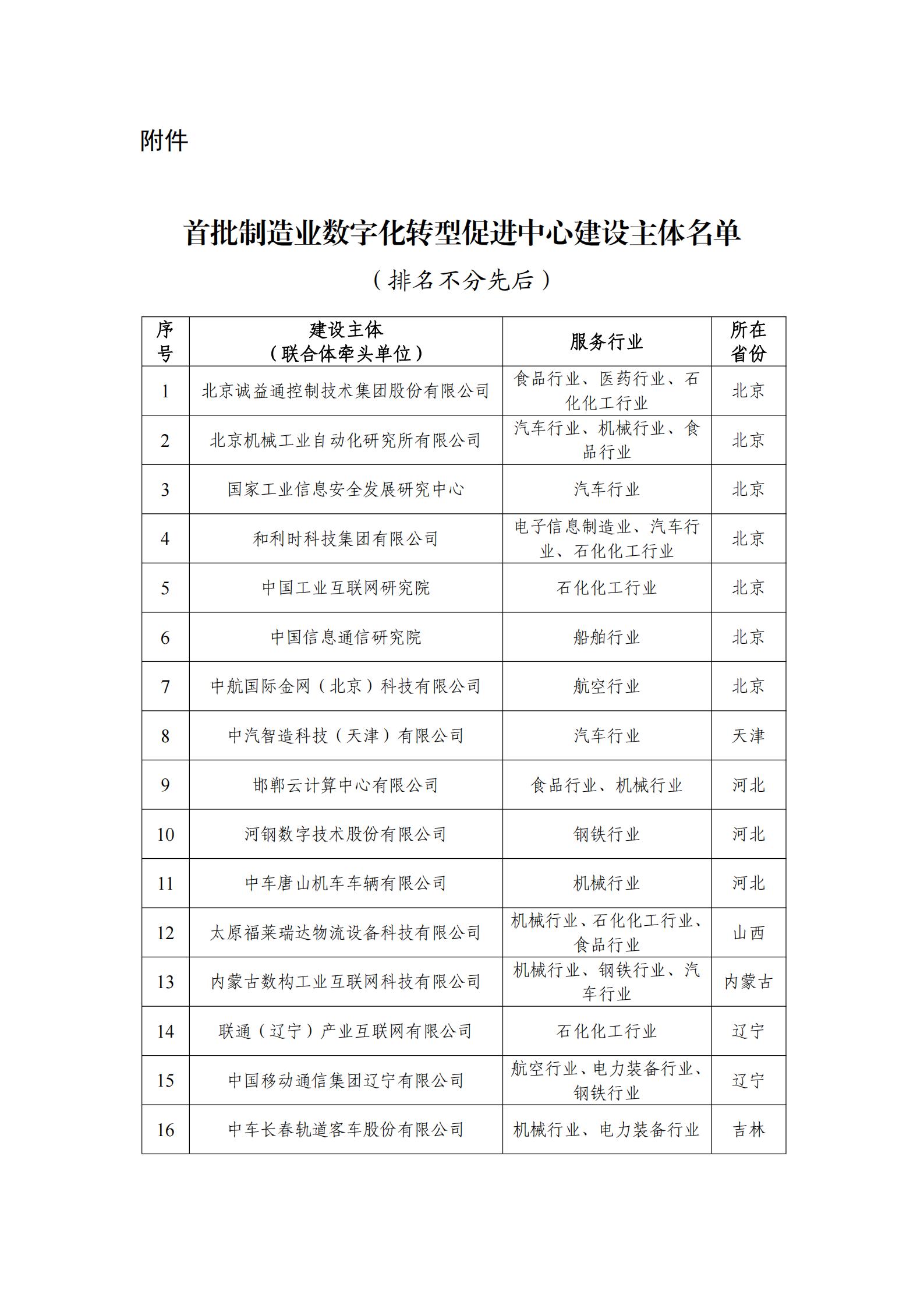 工业和信息化部办公厅关于公布首批制造业数字化转型促进中心建设主体名单的通知
