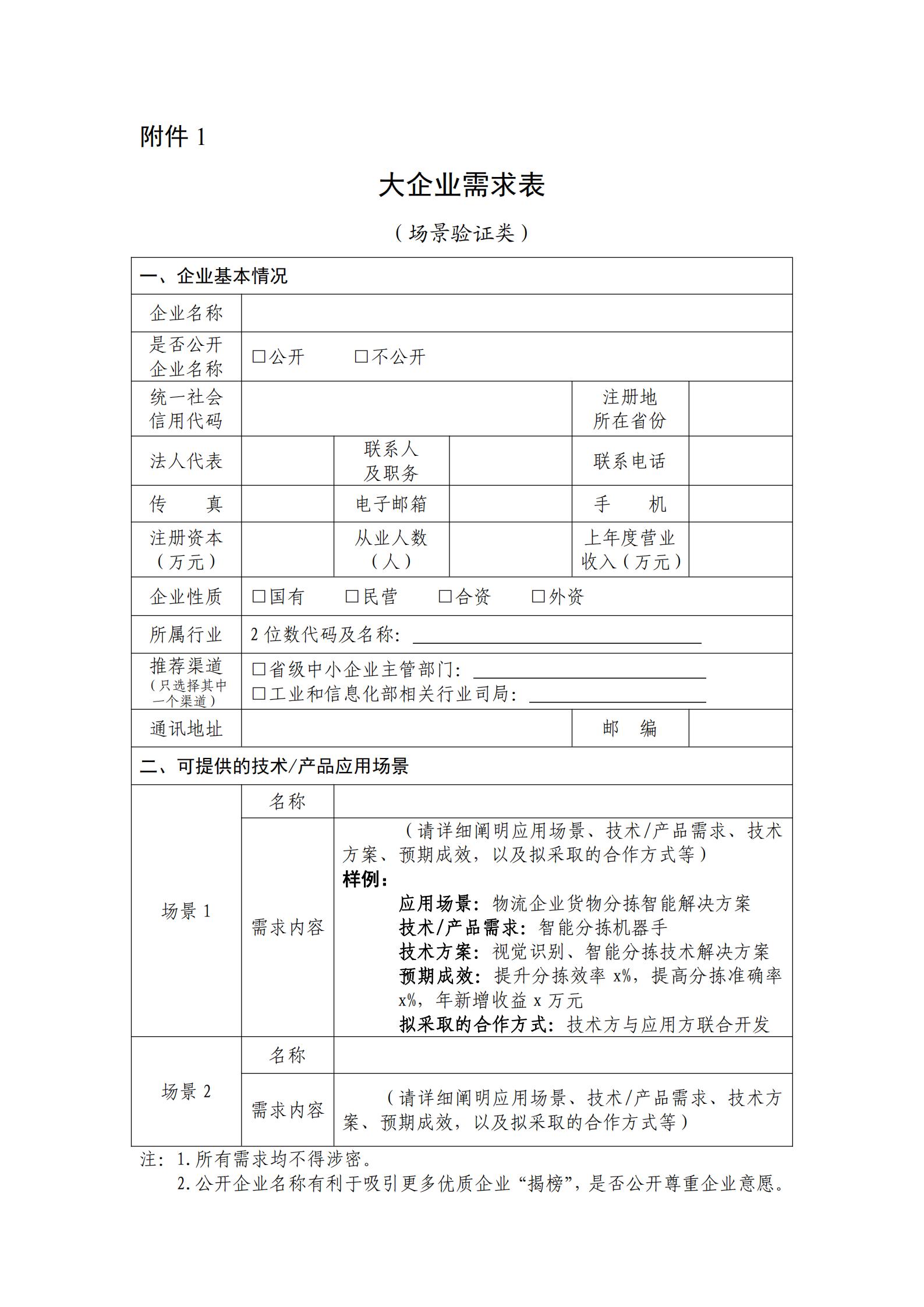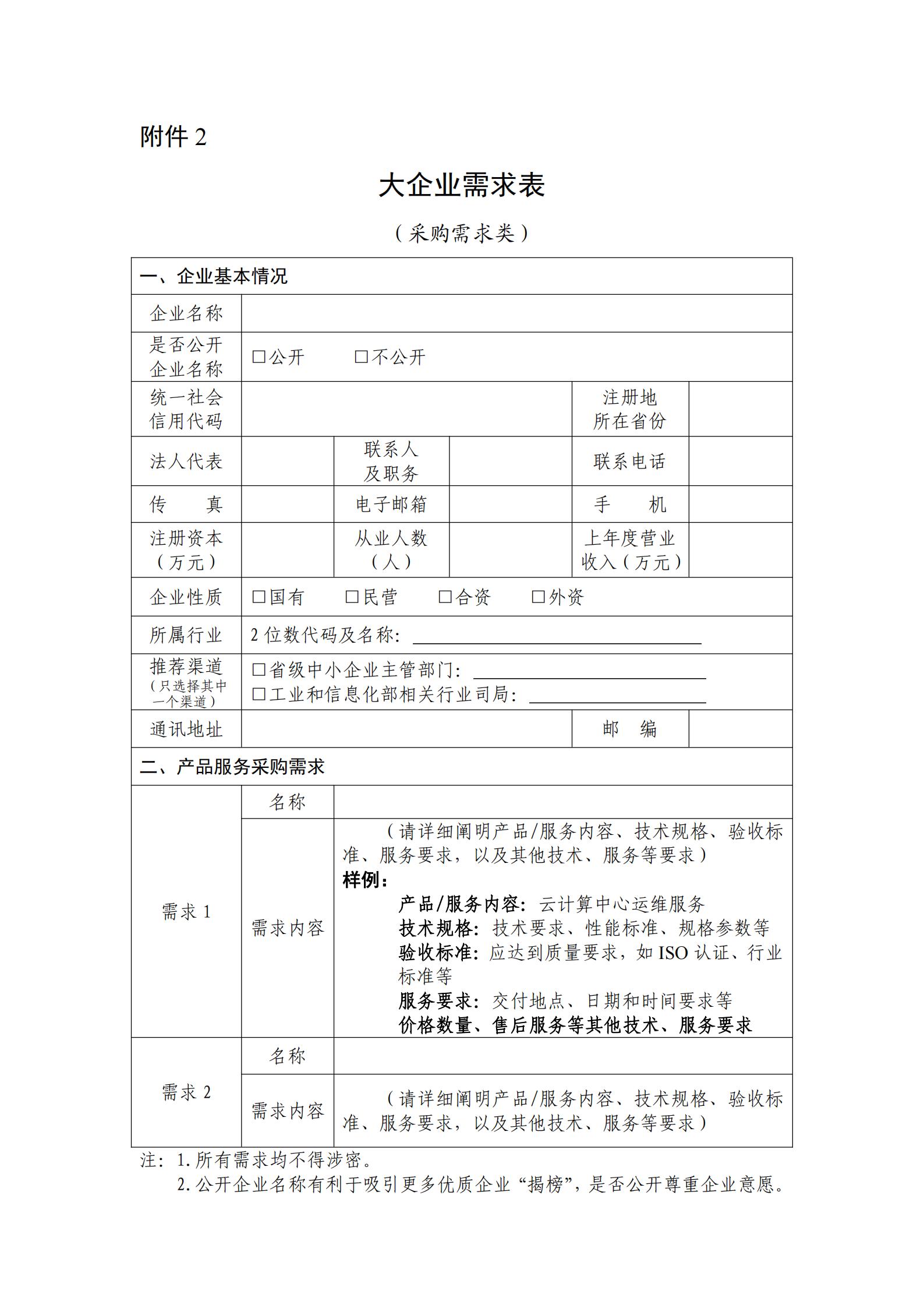 (一)征集大企业需求。各省、自治区、直辖市及计划单列市、新疆生产建设兵团中小企业主管部门(以下统称省级中小企业主管部门)、工业和信息化部相关司局组织动员本地区、本行业有一定带动作用的大企业,结合自身发展实际,重点围绕三方面“发榜”:一是能够为中小企业新技术、新产品提供应用场景验证机会;二是对中小企业产品服务有采购需求,为中小企业融入供应链创新链提供机会;三是愿同中小企业开展联合技术创新攻关。有“发榜”意愿的大企业,可于每季度首月15日前在优质中小企业梯度培育平台(以下简称平台)(https://zjtx.miit.gov.cn/)中供需对接——大企业“发榜”中小企业“揭榜”模块,根据“发榜”类型填写《大企业需求表》(附件1、2、3,可选择是否公开企业名称)。平台将结合需求可行性等情况,筛选形成大企业需求目录,并于每季度首月20日前向社会公开发布。