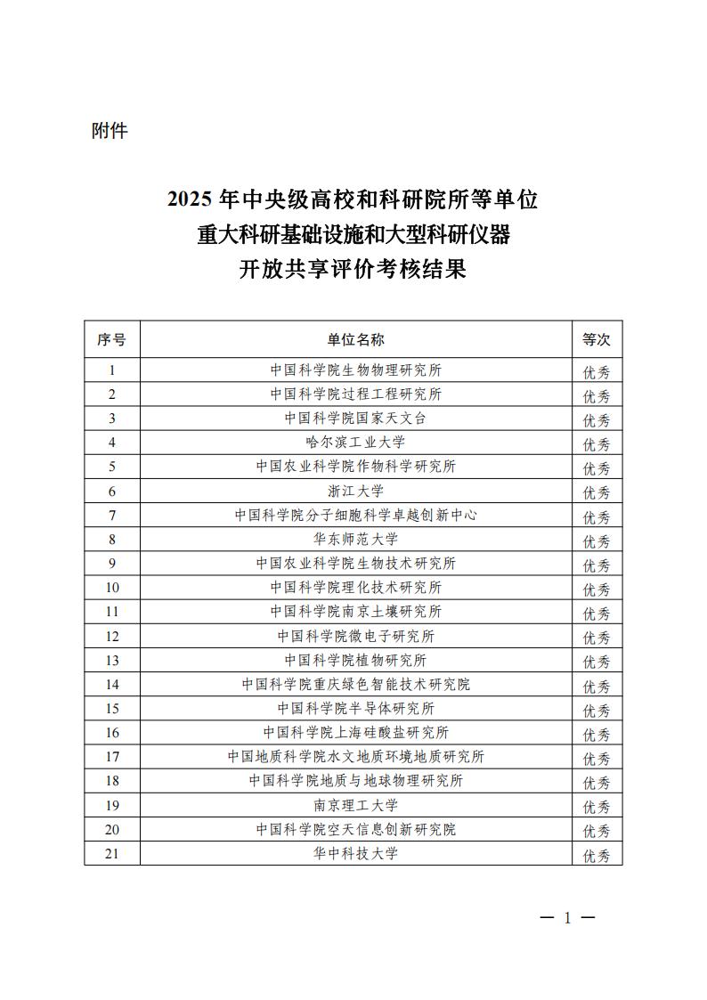 科技部办公厅 财政部办公厅关于发布2025年中央级高校和科研院所等单位重大科研基础设施和大型科研仪器开放共享评价考核结果的通知