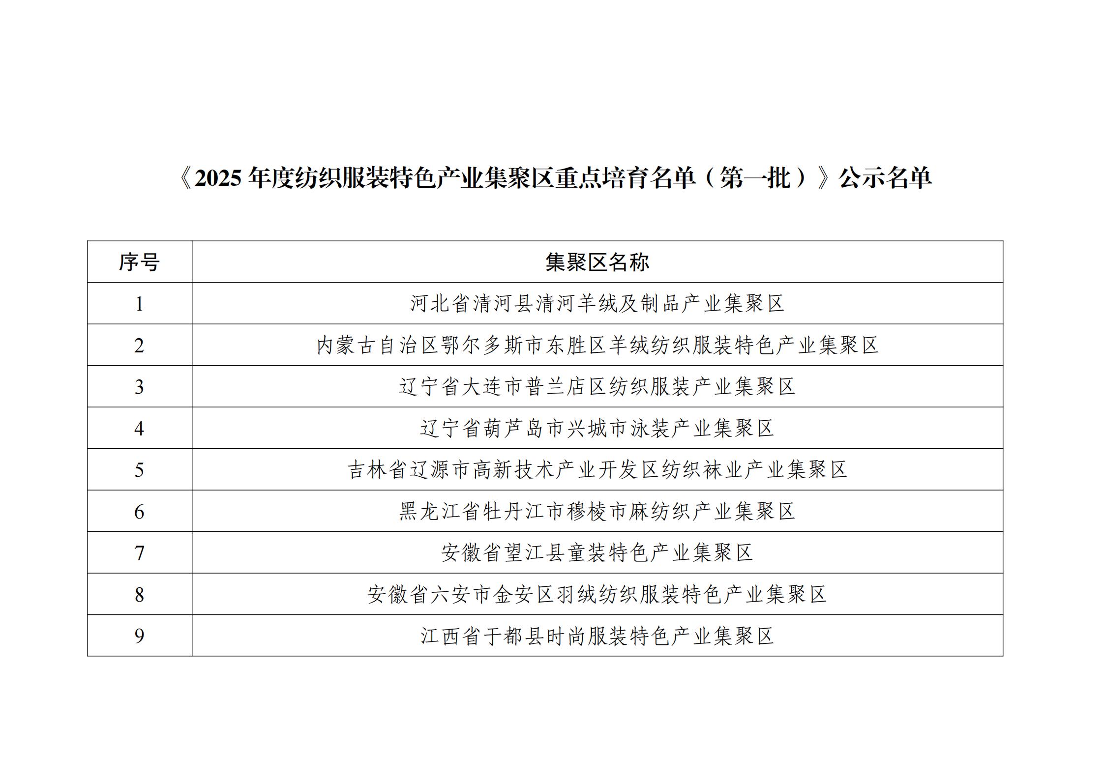 附件:《2025年度纺织服装特色产业集聚区重点培育名单(第一批)》公示名单