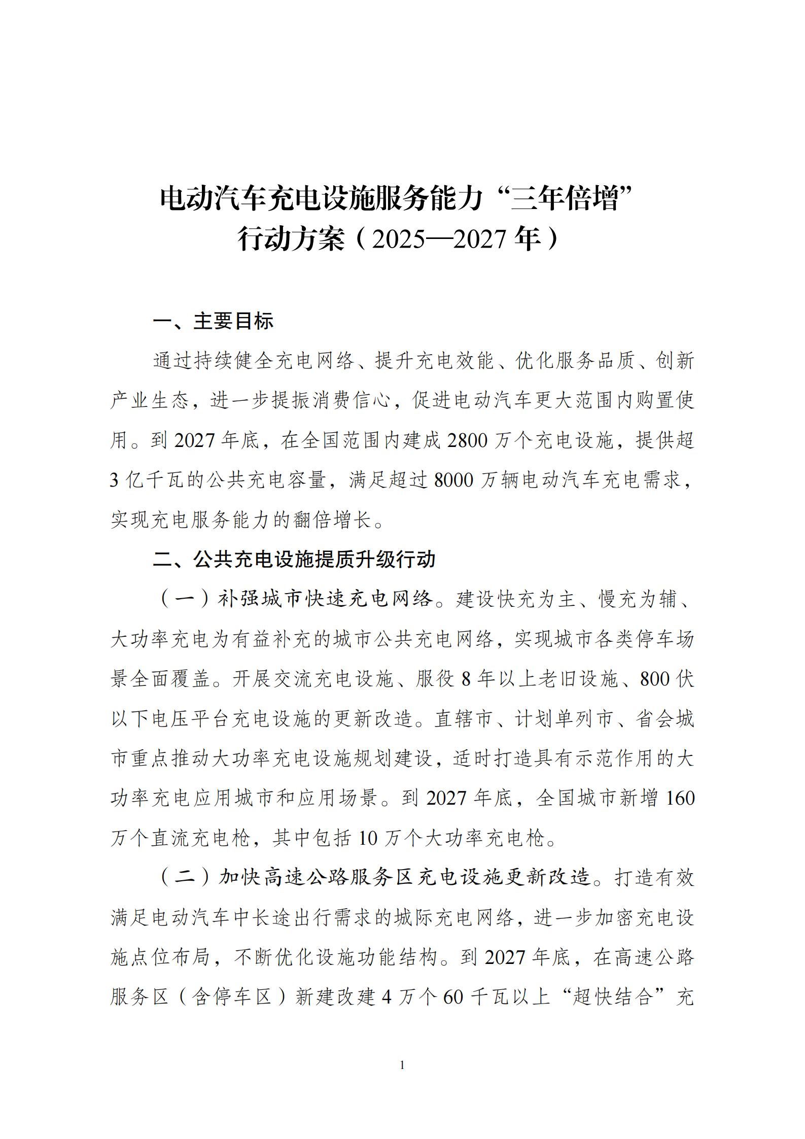 为落实《提振消费专项行动方案》有关要求,加大力度完善电动汽车充电设施服务网络,提升消费品质,促进电动汽车更大范围内购置使用,国家发展改革委等部门研究制定了《电动汽车充电设施服务能力“三年倍增”行动方案(2025—2027年)》,现印发给你们,请认真组织落实。