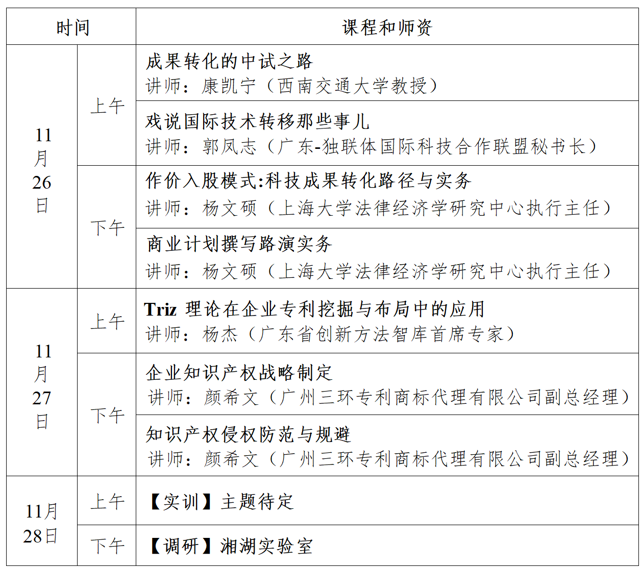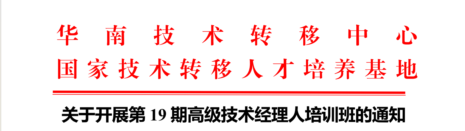 为贯彻《中华人民共和国促进科技成果转化法》《国家技术转移体系建设方案》和《 “十 四五”技术要素市场专项规划》有关精神,创新技术转移人才发展机制,培养高素质、专业化的技术转移人才,助力我国经济高质量发展和创新型国家建设。华南技术转移中心将联合国家技术转移人才培养基地定于2025年11月26-28日在杭州举办“ 第19期高级技术经理人培训班” ,具体通知如下: