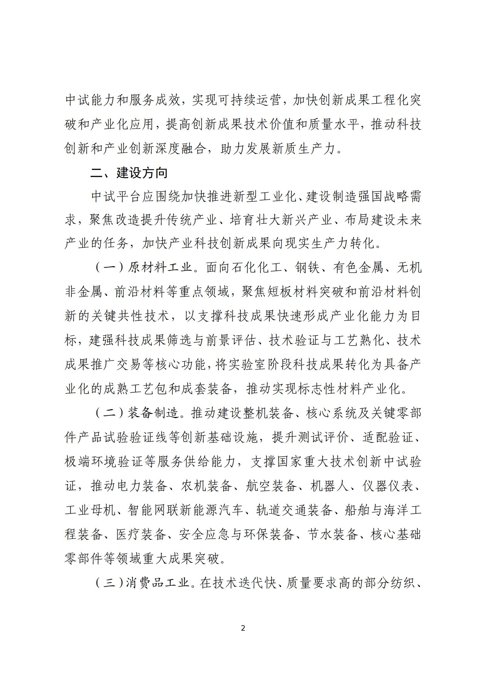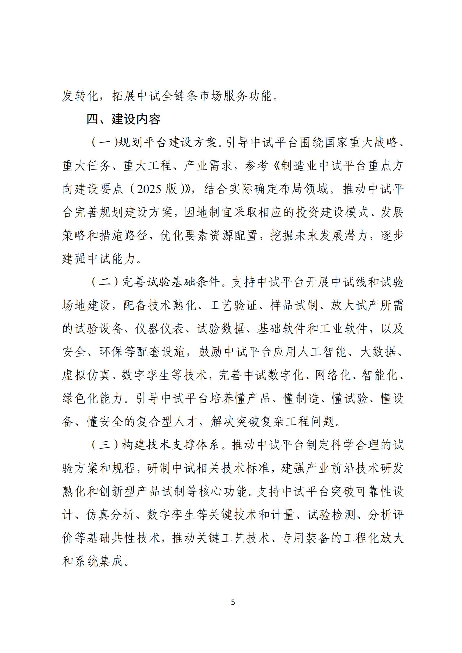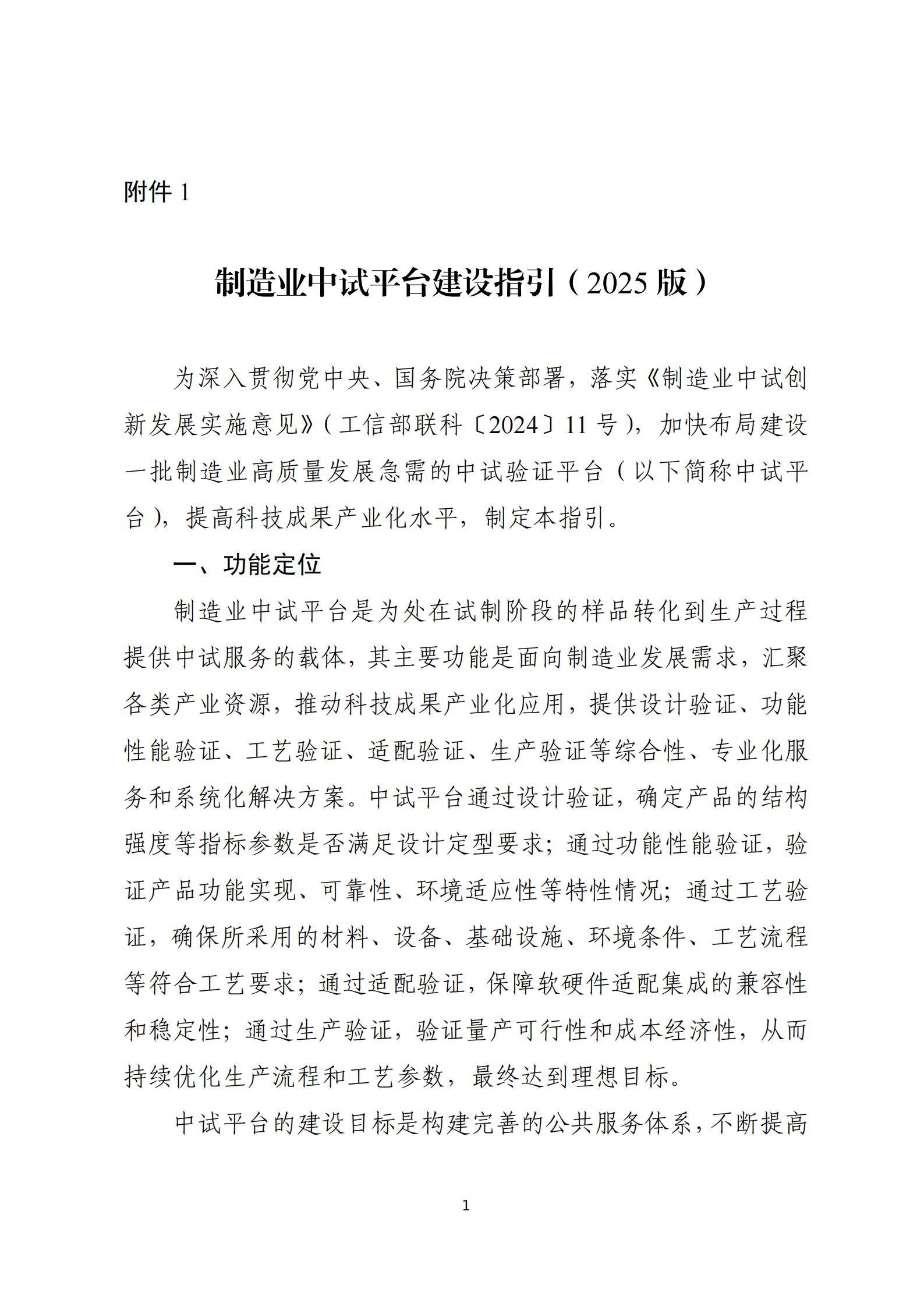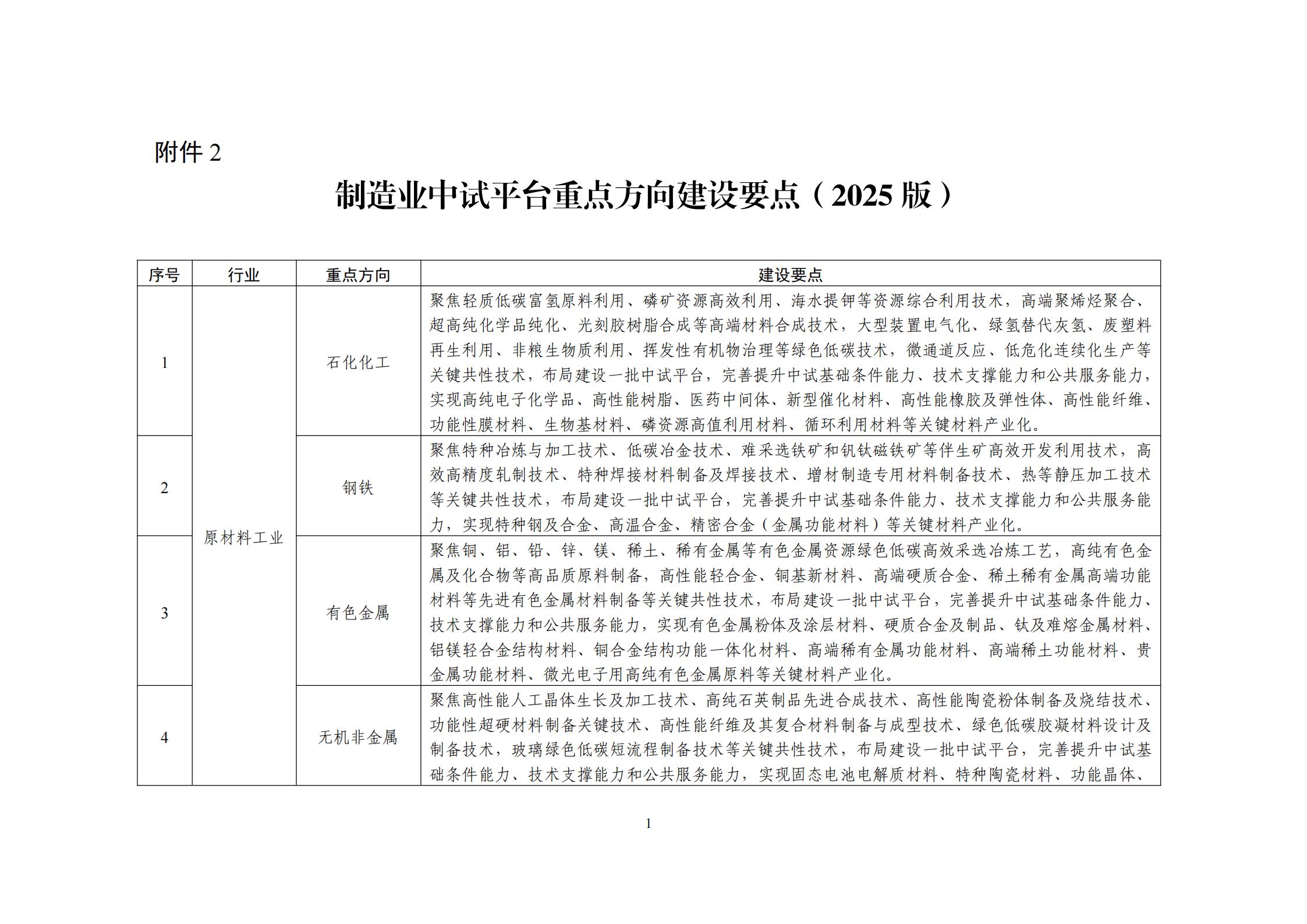 根据《制造业中试平台建设指引(2025版)》(附件1)、《制造业中试平台重点方向建设要点(2025版)》(附件2),按照“做强一批、激活一批、补齐一批”的推进思路,突出公共服务性质和功能,明确建设路径,系统化推动中试平台建设发展。