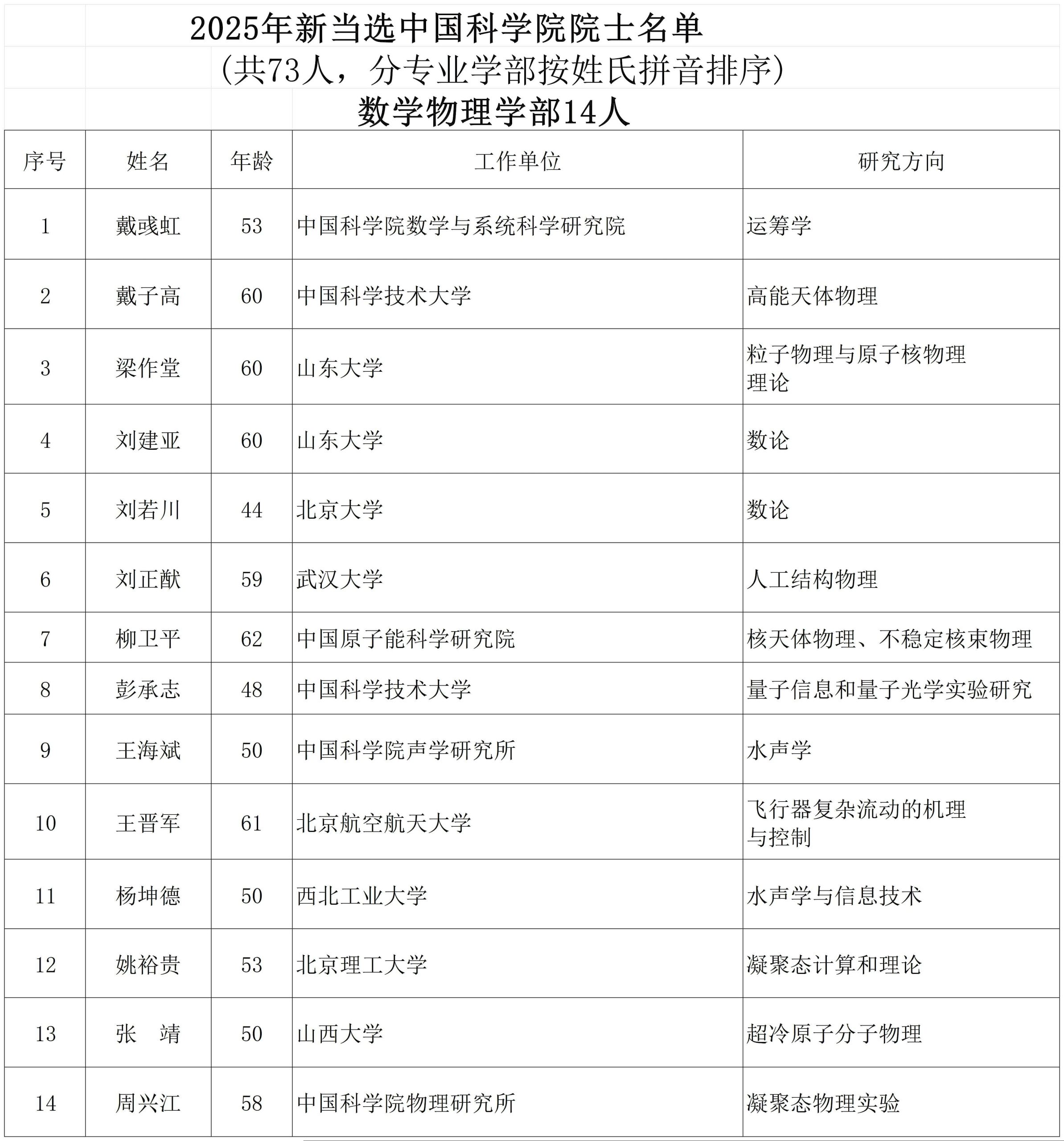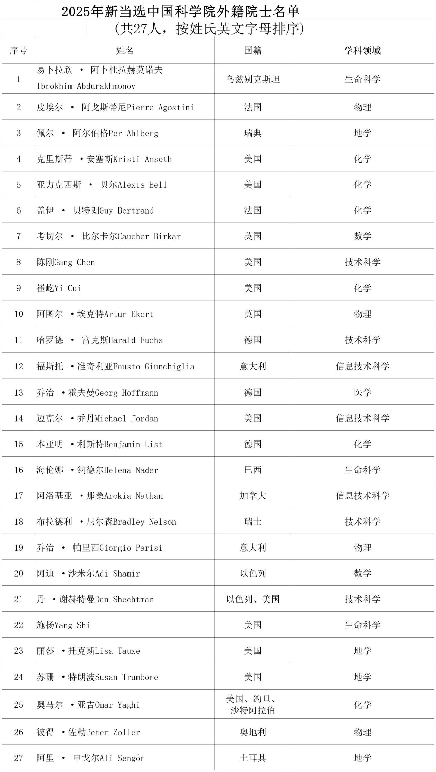 根据《中国科学院院士章程》《中国科学院院士增选工作实施办法(试行)》《中国科学院外籍院士选举办法》等规定,2025年中国科学院选举产生了73名中国科学院院士和27名中国科学院外籍院士。