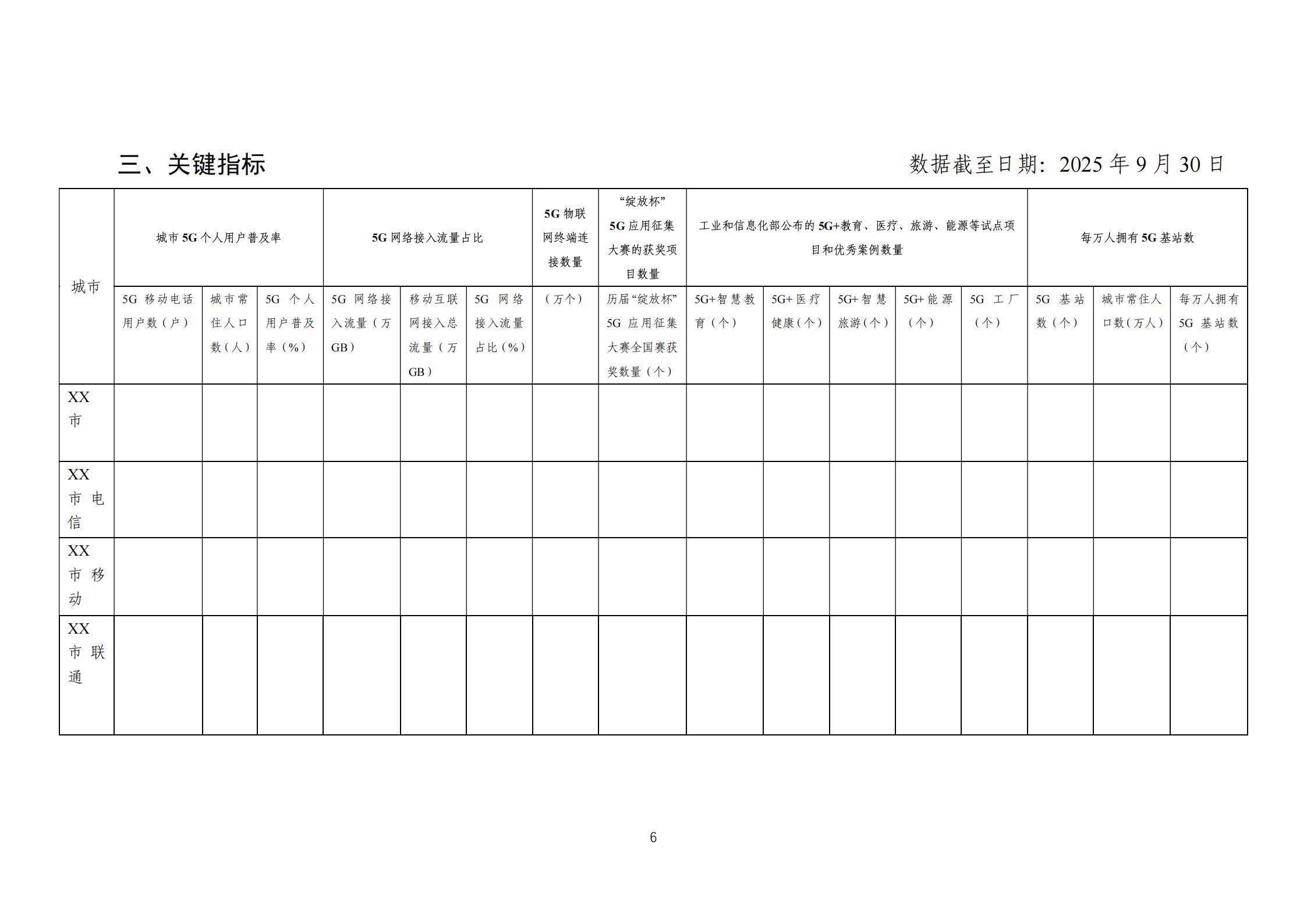 (二)评估报送阶段(2025年12月)。各地通信管理局会同工业和信息化主管部门,结合本区域实际情况,总结评估5G应用“扬帆”行动重点城市5G发展及应用情况,切实做好关键指标数据核实,于2025年12月30日前在5G应用“扬帆”行动发展监测平台(https://5gyfcs.cn:56101)填报发展情况报告(见附件2),并将纸质版材料报送工业和信息化部(信息通信发展司)。