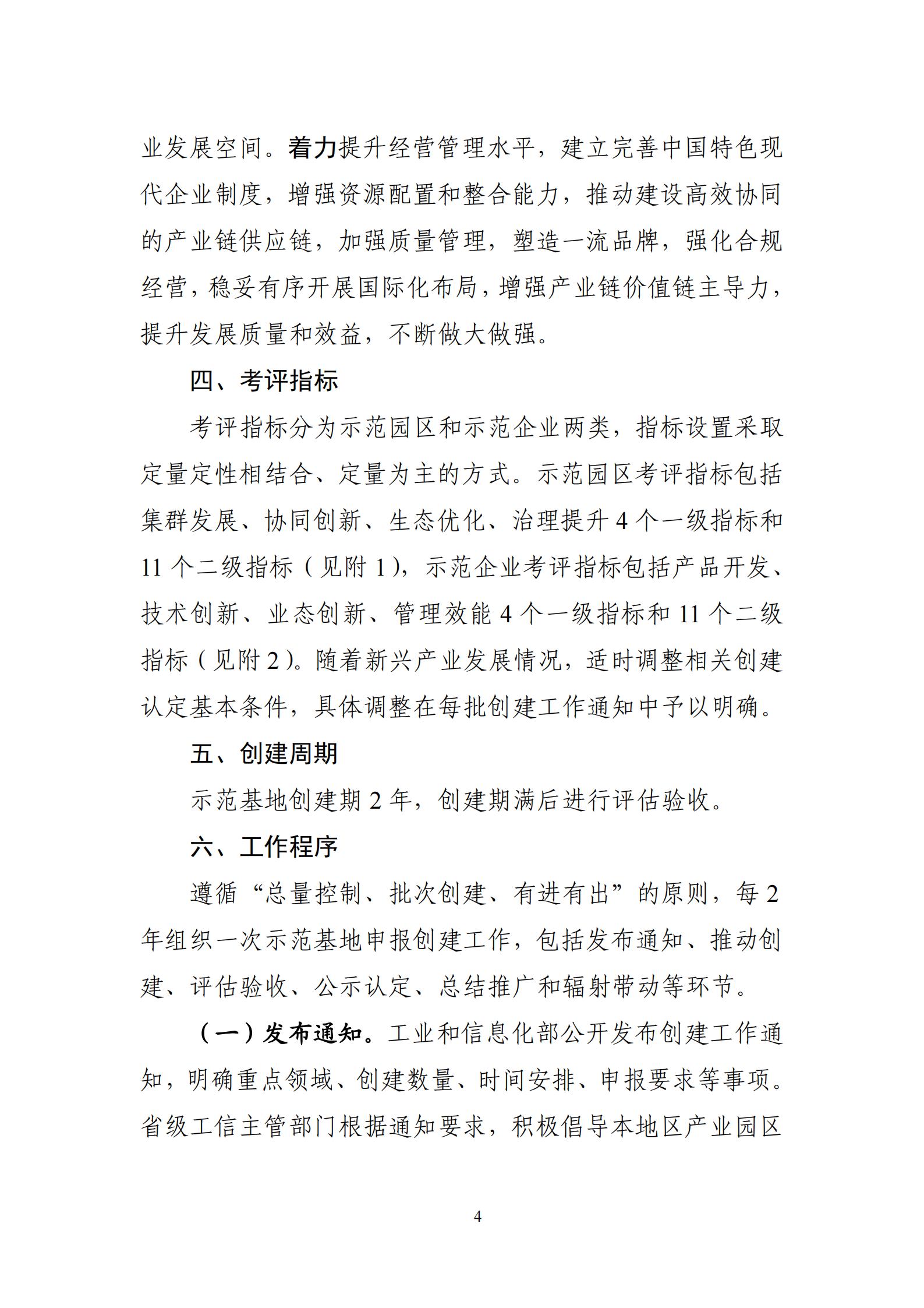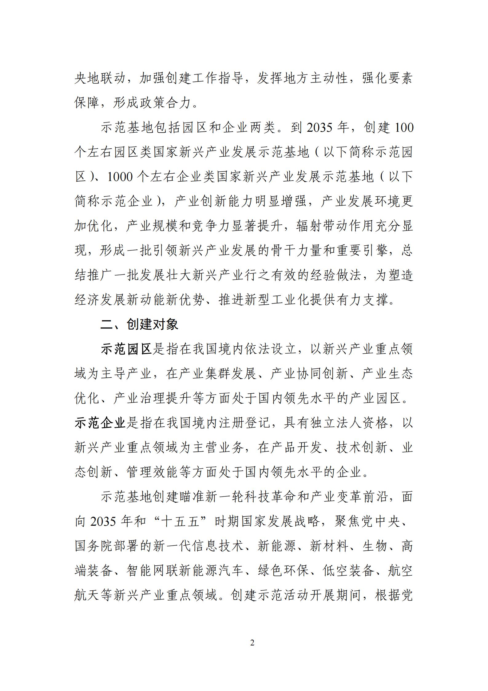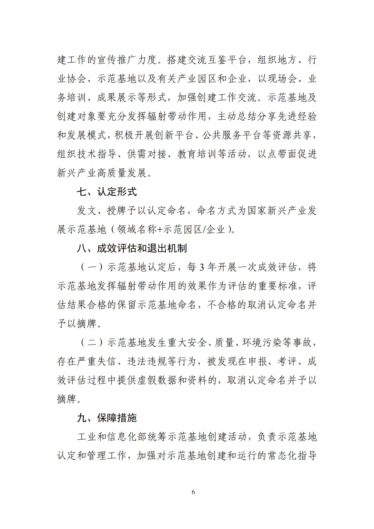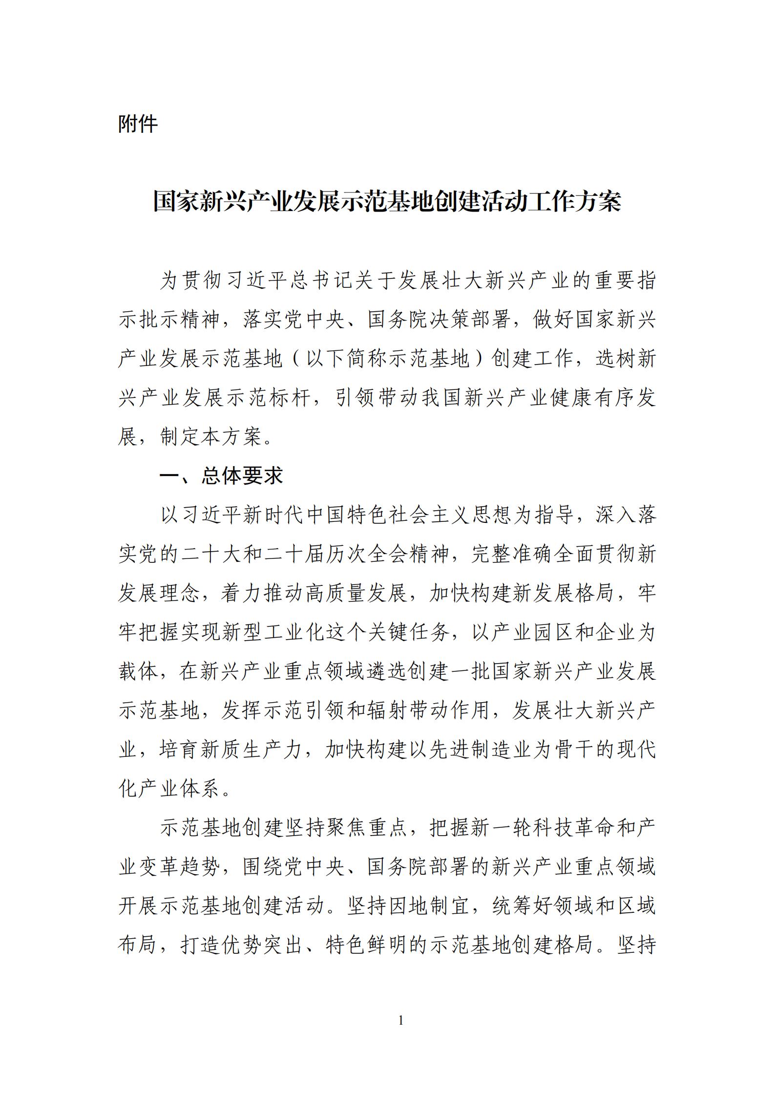 为贯彻落实党中央、国务院关于发展壮大新兴产业的决策部署,选树新兴产业发展示范标杆,引领带动我国新兴产业健康有序发展,工业和信息化部决定开展“国家新兴产业发展示范基地”(以下简称示范基地)创建活动。请按照《国家新兴产业发展示范基地创建活动工作方案》要求,组织做好本地区示范基地创建工作。