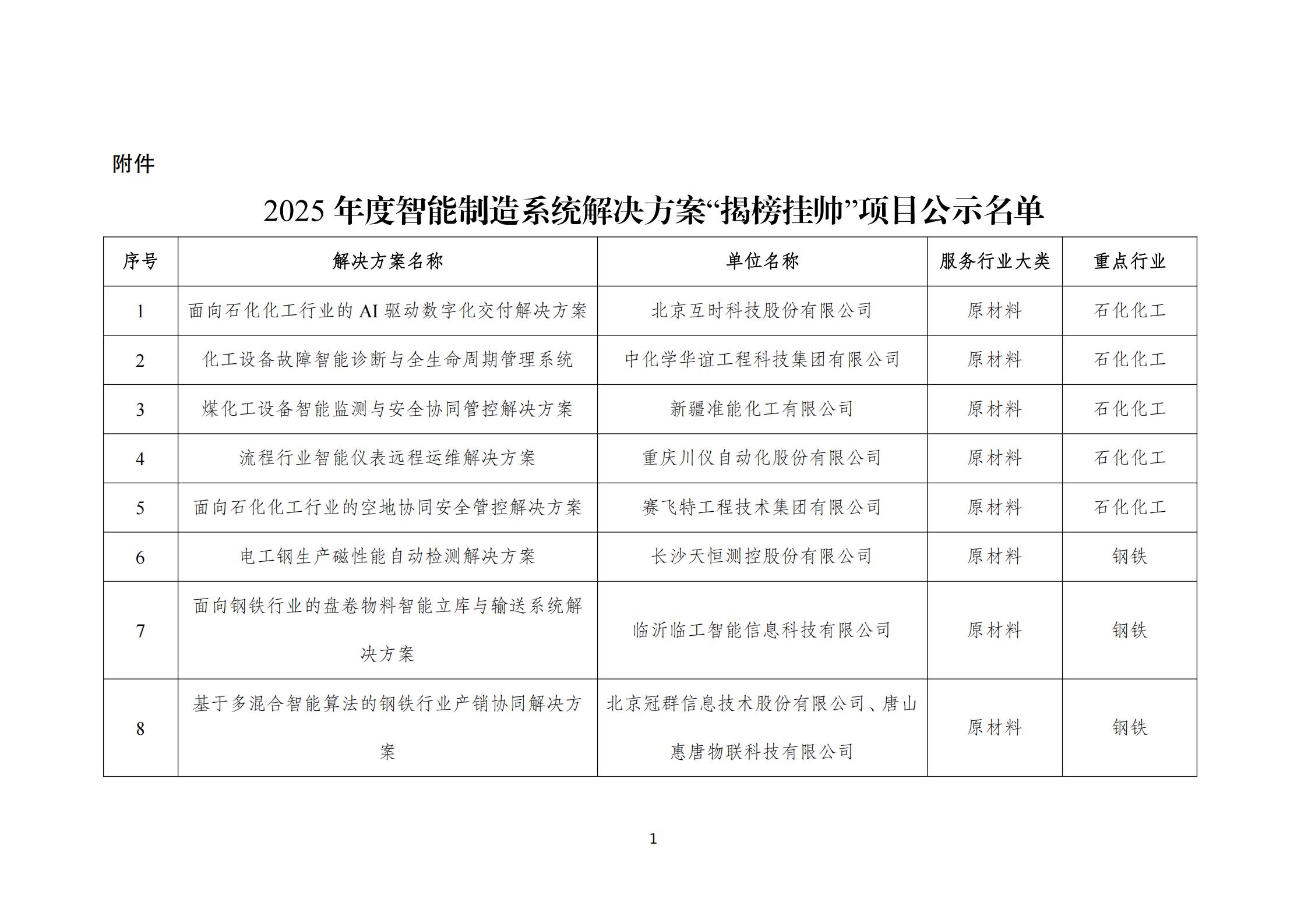 根据《关于开展2025年度智能制造系统解决方案“揭榜挂帅”项目申报和已揭榜项目验收工作的通知》(工信厅联通装函〔2025〕411号),现将拟入选的2025年度智能制造系统解决方案“揭榜挂帅”项目名单进行公示,请社会各界监督。如有异议,请在公示期内将书面意见反馈至工业和信息化部装备工业一司(智能制造处)。